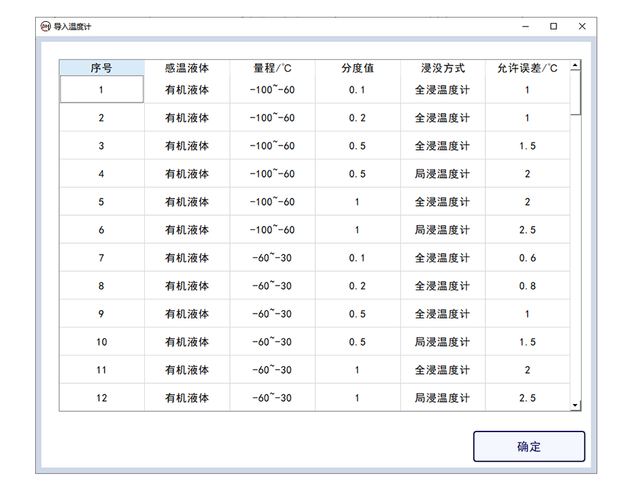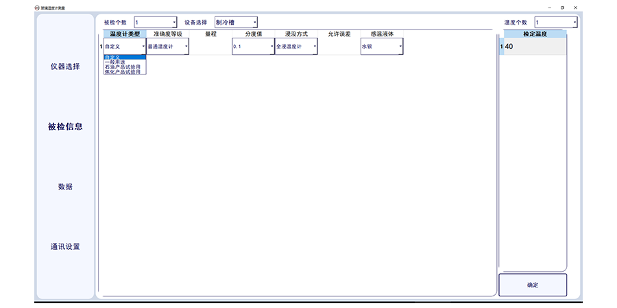 4.可進行玻璃溫度計的類型選擇,選擇分度值、浸沒類型計允差,判斷溫度是否合格,