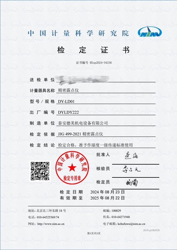 露點儀檢定證書 2024-9-3 本文被閱讀 6922 次