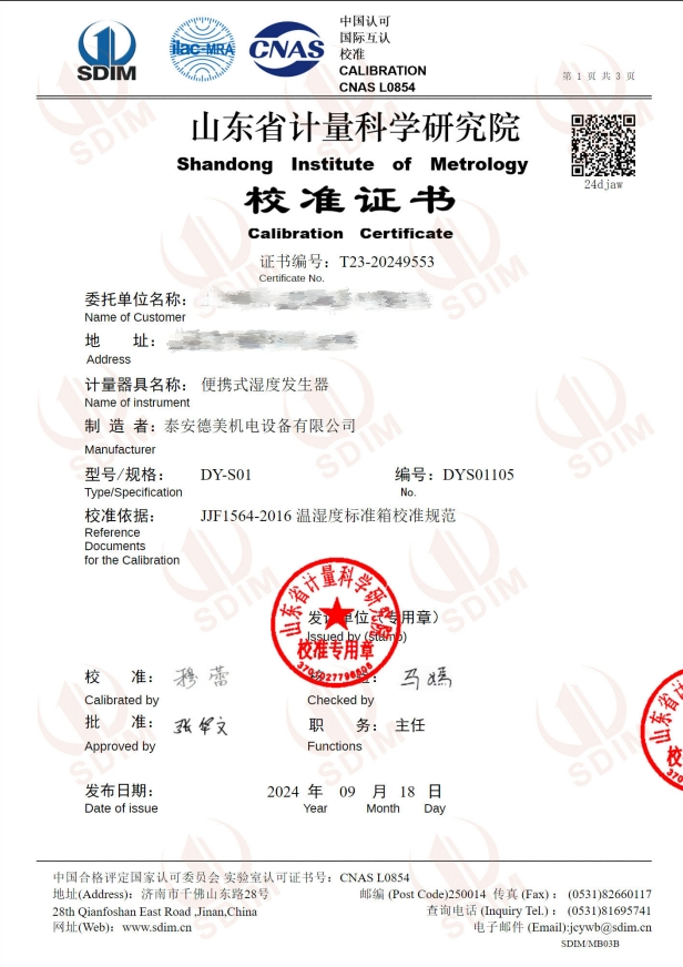 便攜式濕度發(fā)生器(5~50℃)校準(zhǔn)證書 2024-9-20 本文被閱讀 7273 次