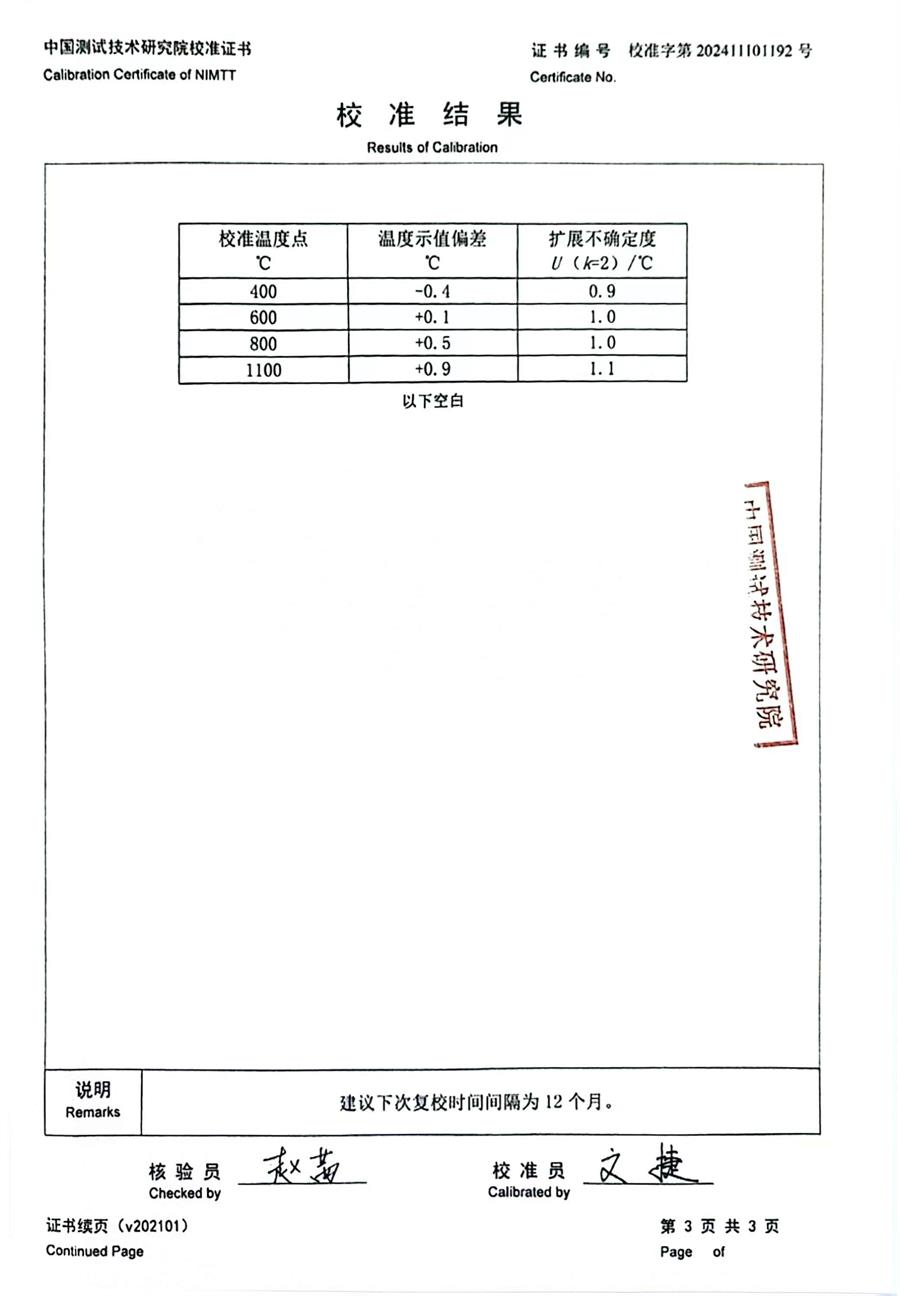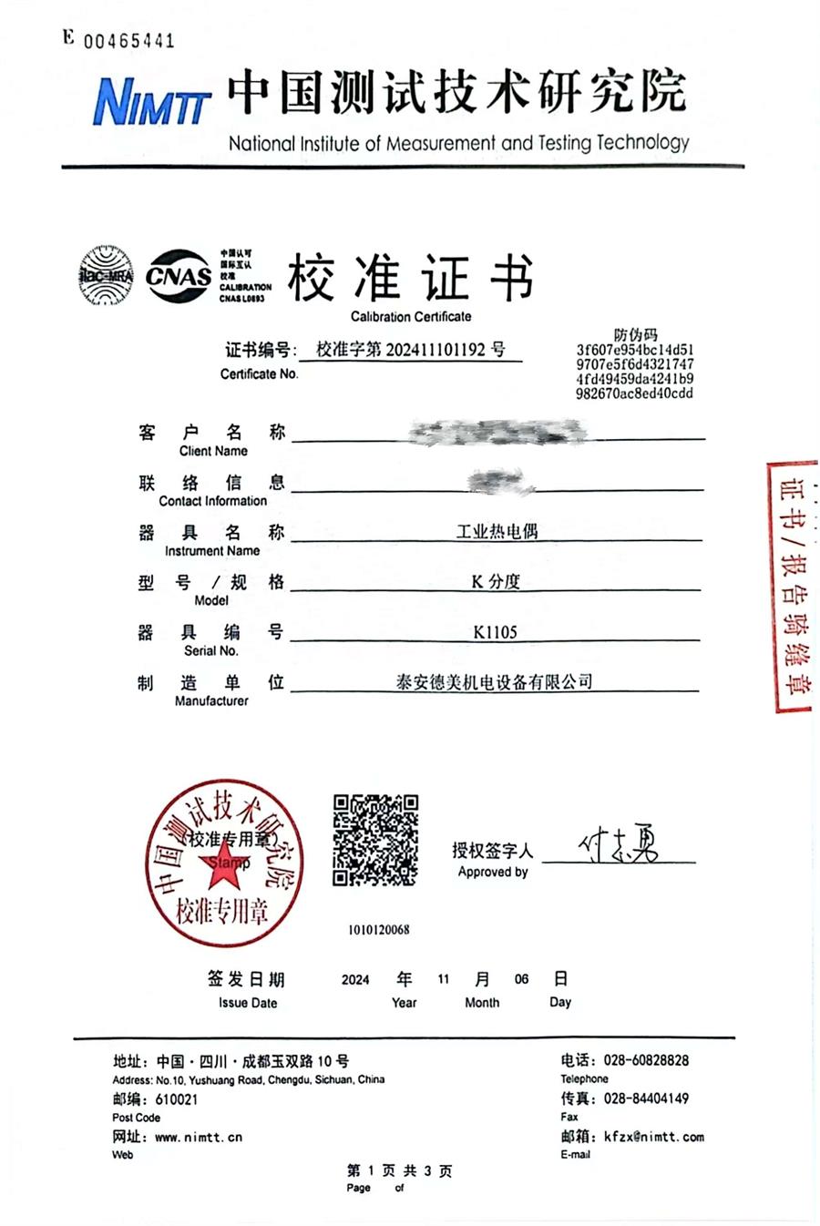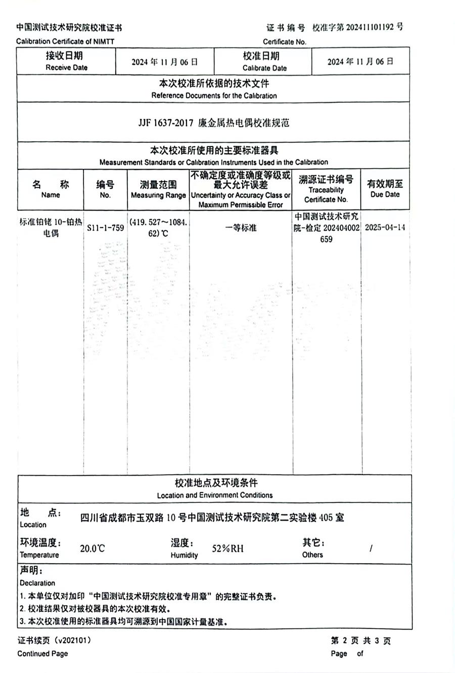 K分度熱電偶校準證書 2024-11-9 本文被閱讀 7858 次