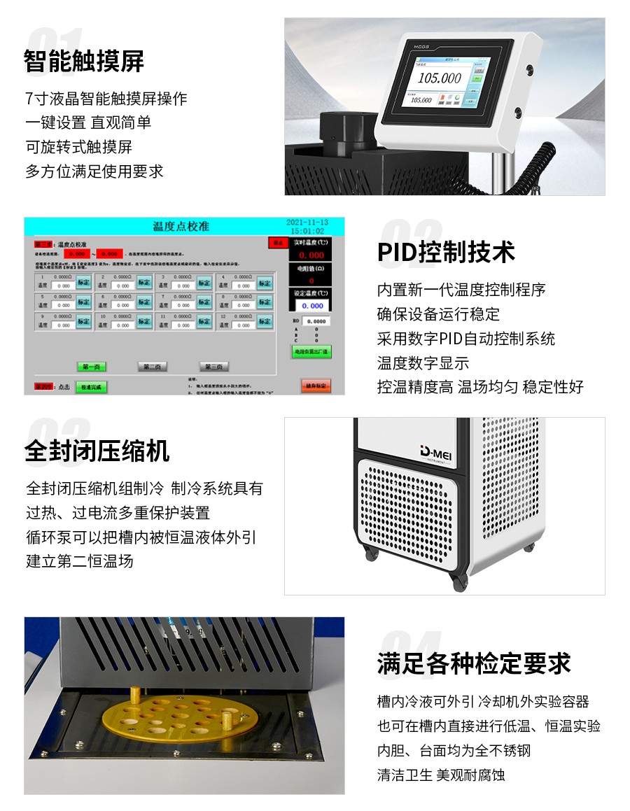 DY-RTS40制冷恒溫槽(-40℃/-30℃~105℃)是高精度自控式溫度檢定設(shè)備,控溫精度高,溫場(chǎng)均勻,穩(wěn)定性好,操作方便,采用全封閉壓縮機(jī)制冷系統(tǒng),外殼和內(nèi)膽都采用全不銹鋼材料制造,產(chǎn)品供計(jì)量部門(mén)作一、二等標(biāo)準(zhǔn)水銀溫度計(jì),貝克曼溫度計(jì)。工業(yè)鉑熱電阻,標(biāo)準(zhǔn)銅-康銅熱電偶檢定之用,也可作高精度熱、冷源供生產(chǎn)、科研使用。制冷恒溫槽是一種高精度自控式數(shù)顯溫度檢定裝置,它具有溫度穩(wěn)定性好,溫場(chǎng)均勻,控溫精度高等特點(diǎn)。制冷系統(tǒng)采用全封閉制冷機(jī),具有噪音低、可靠性好、壽命長(zhǎng)。數(shù)顯溫控儀按PID調(diào)節(jié)規(guī)律實(shí)現(xiàn)溫度自動(dòng)控制,結(jié)構(gòu)緊湊、操作方便、槽溫讀數(shù)直觀。適用于各計(jì)量、生化、石油、氣象、能源、環(huán)保、醫(yī)藥等部門(mén)及生產(chǎn)溫度計(jì)、控溫器等廠家進(jìn)行物理參數(shù)的檢測(cè),并可為其他實(shí)驗(yàn)研究工作提供恒溫源。