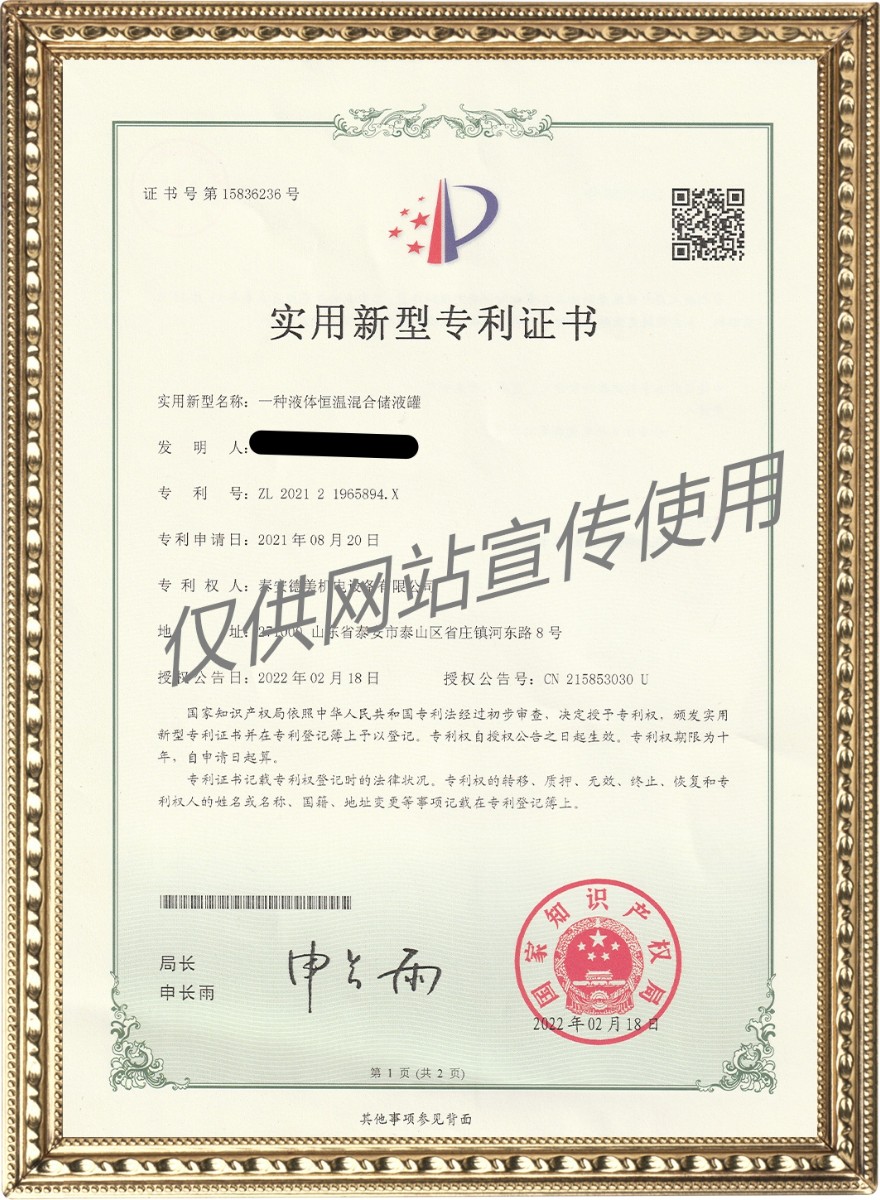一種液體恒溫混合儲液罐——實用新型專利證書 2023-2-7 本文被閱讀 15359 次