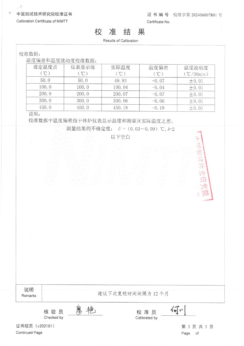 中溫干體爐(50~450℃)校準(zhǔn)證書 2024-7-1 本文被閱讀 6727 次