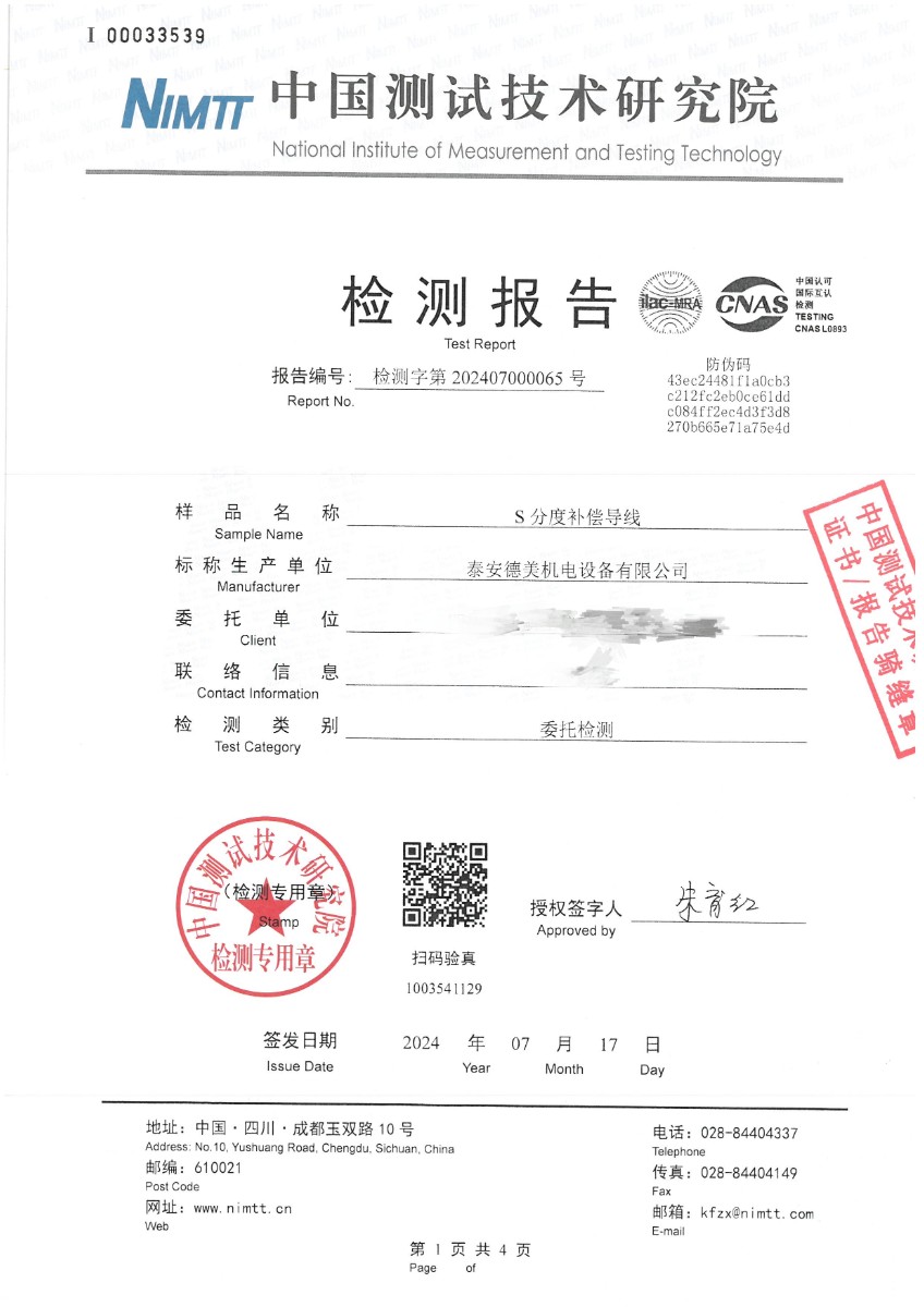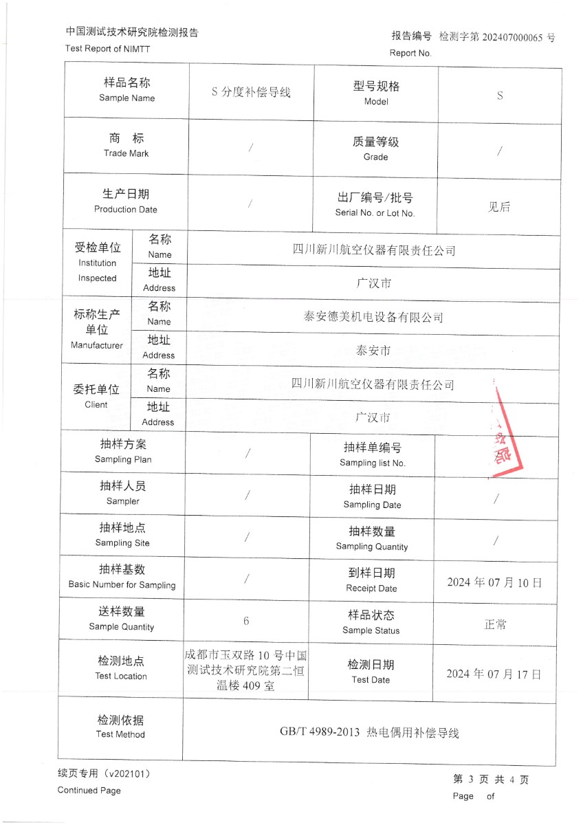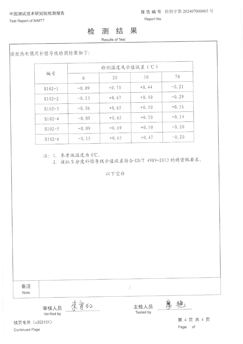 熱電偶用補(bǔ)償導(dǎo)線S分度檢測報告 2024-7-19 本文被閱讀 7821 次
