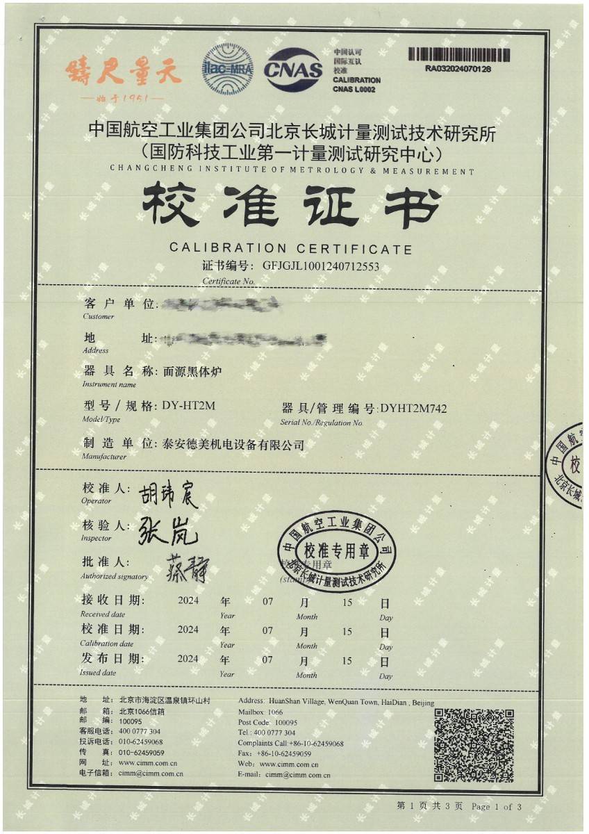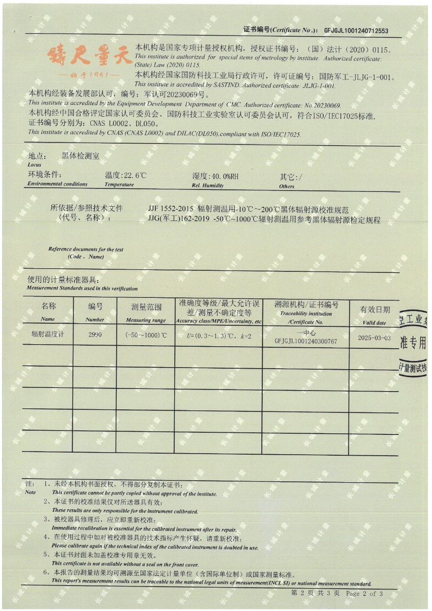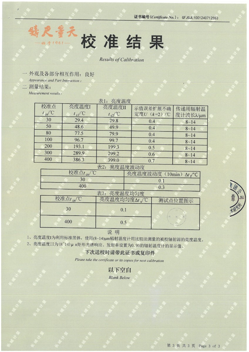 面源黑體爐(室溫+5℃~400℃)校準證書 2024-7-29 本文被閱讀 8195 次