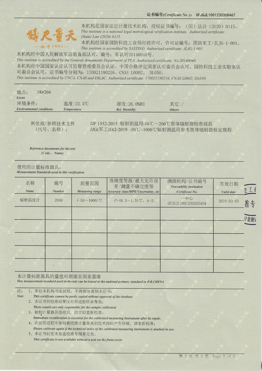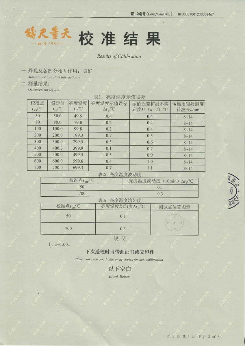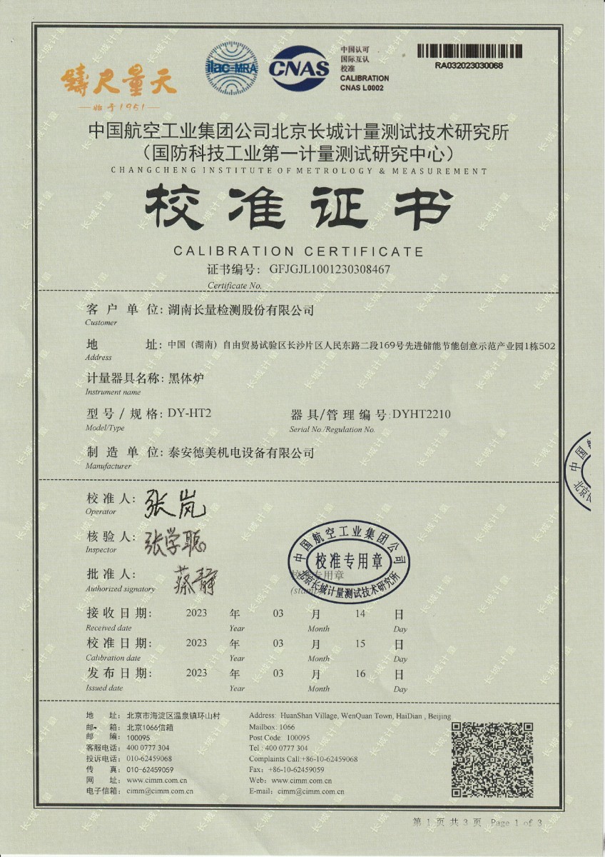 湖南長量檢測股份有限公司 黑體爐 校準證書 2023-3-31 本文被閱讀 12860 次