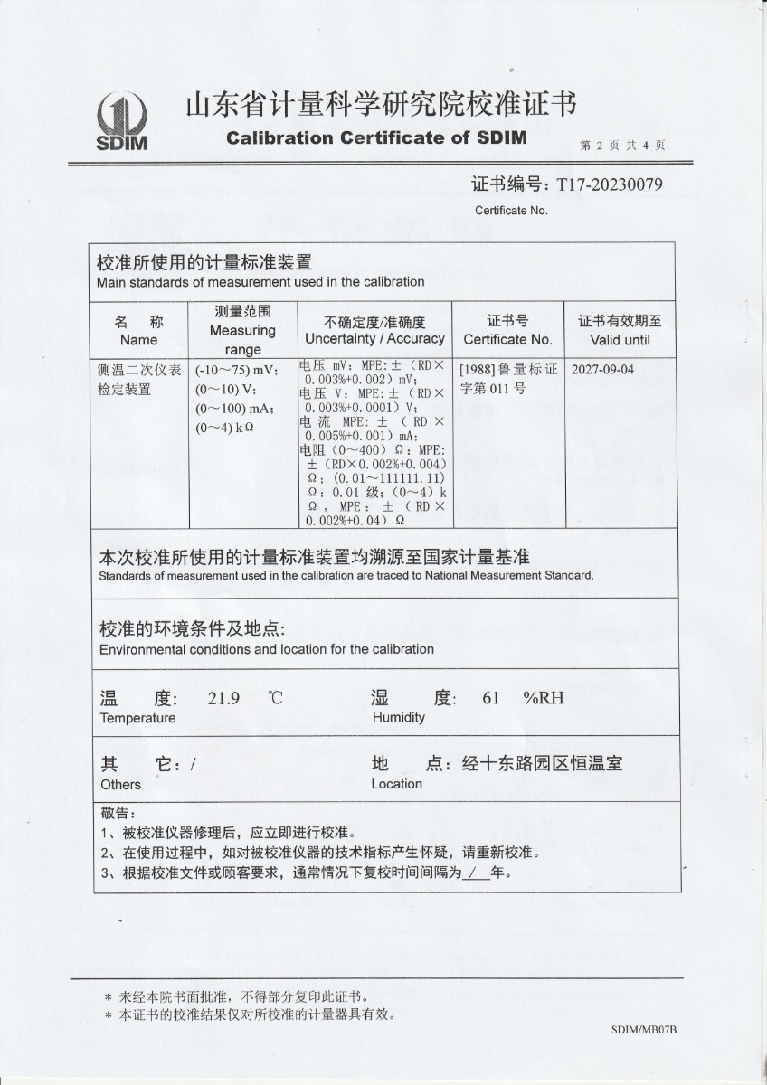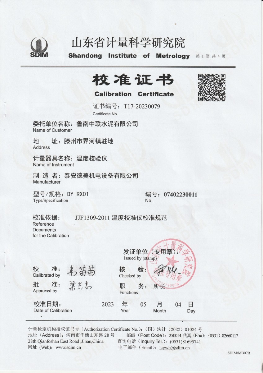 魯南中聯(lián)水泥有限公司 溫度校驗儀 校準證書 2023-5-26 本文被閱讀 15099 次