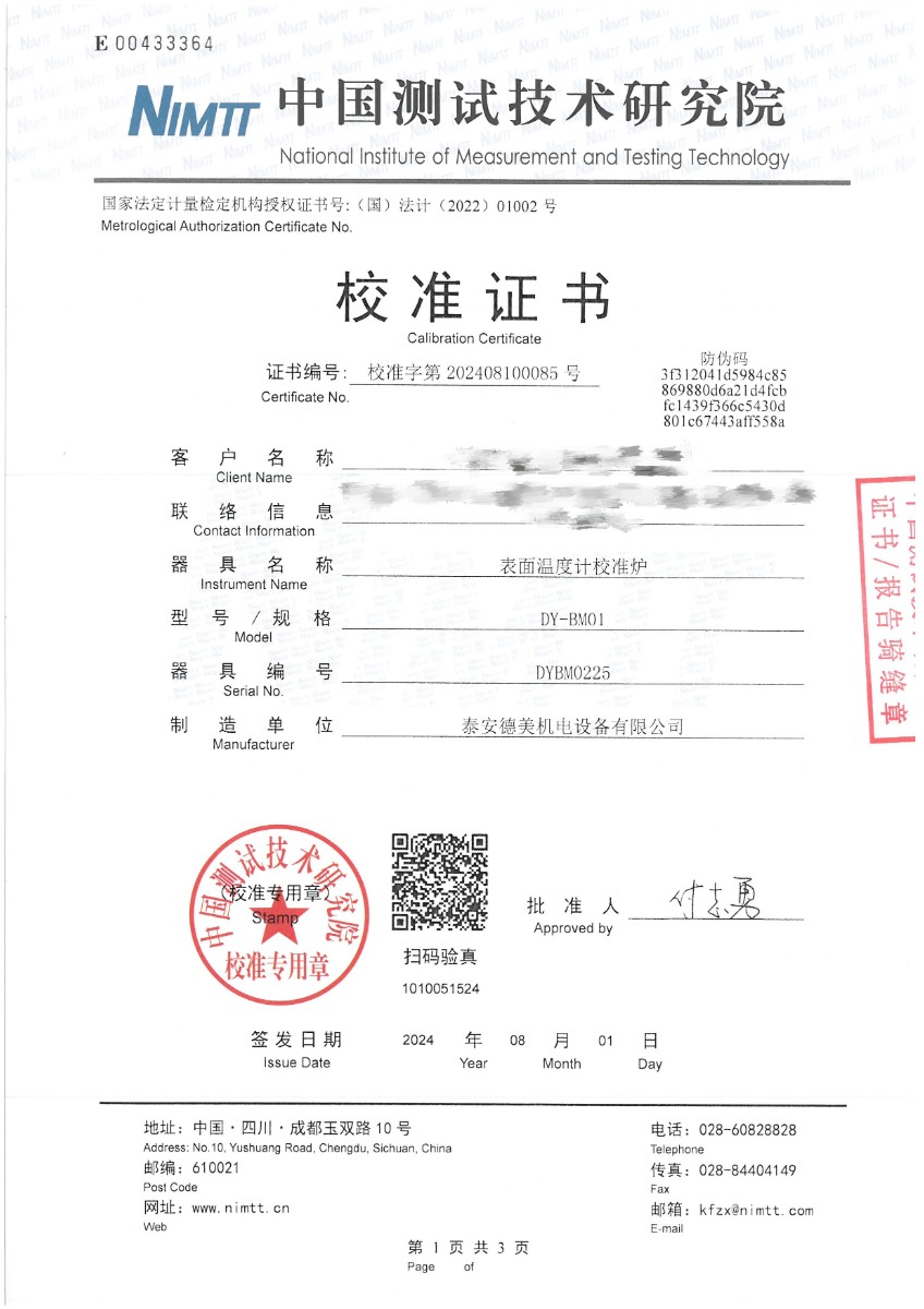 | 上一條:干體爐301(室溫+5℃~650℃)校準(zhǔn)證書 | 下一條:DY-HT2M-C高溫面源黑體爐(100mm) |