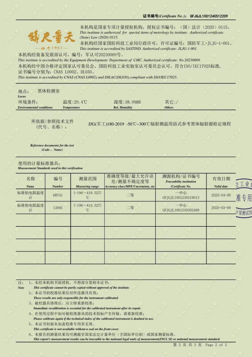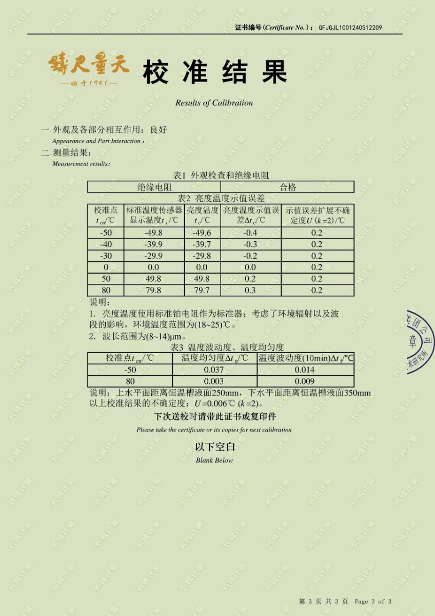 低溫浴式黑體輻射源校準證書 2024-5-31 本文被閱讀 9226 次